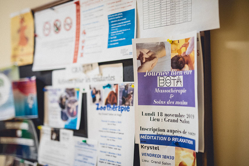 In the living room, high screens create a cocoon around massage therapists and residents while the classical music in the background, acts as a lullaby. Back to back, almost creating the shape of a star, the massage therapists orchestrate a waltz in silence, one gesture at a time. After a 30-minute massage, the residents emerge from a state of pronounced well-being. Hair undone, their sleepy eyes have softened, sharing their gratitude with us.