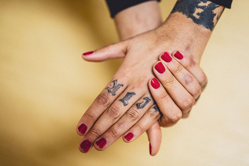 Another hesitates a long time between a dark red and a fuchsia. Delighted to have managed to grow her nails this long, she opts for the pink shade that will sublimate the tattoos on her phalanges.