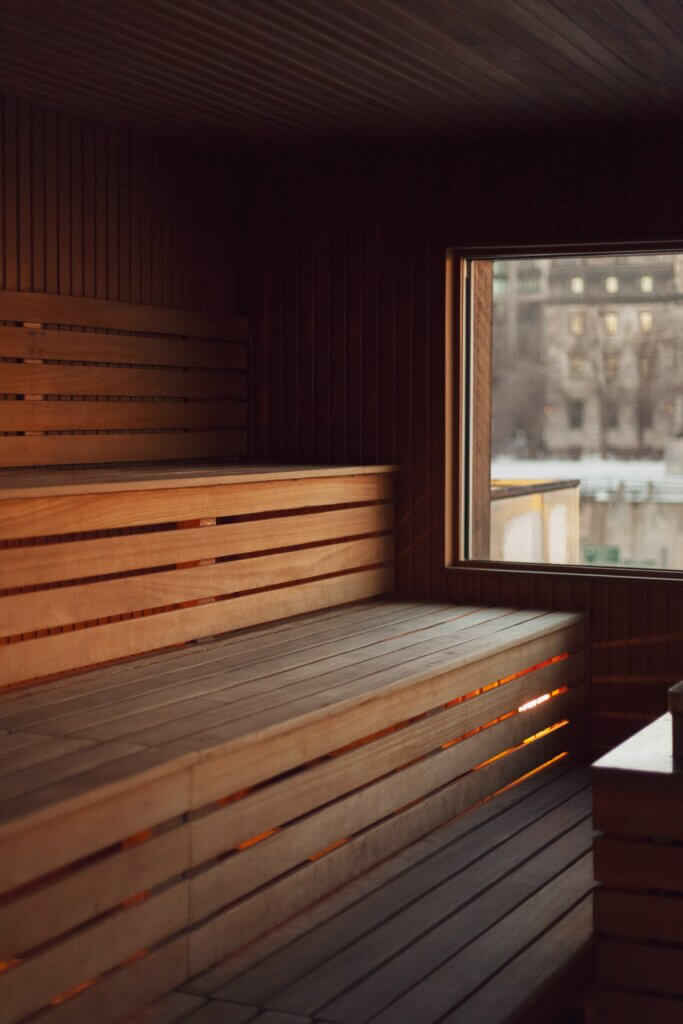 Dans les saunas accessibles à bord et dans les Jardins, le bois s’impose avec évidence. Utilisé pour ses qualités thermiques mais aussi émotionnelles, il évoque le cocon, l’intime, l’organique. Le toucher du bois brut, sa chaleur accumulée, son parfum subtil, créent un espace de réconfort. Il permet à chacun de se détendre, de s’ancrer dans une expérience corporelle simple et essentielle. Chaque latte raconte une histoire de chaleur et du silence.