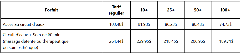 - Employé : 15% de rabais sur les soins et massages + circuit d’eaux avec gratuité et/ou rabais selon l’horaire réservé